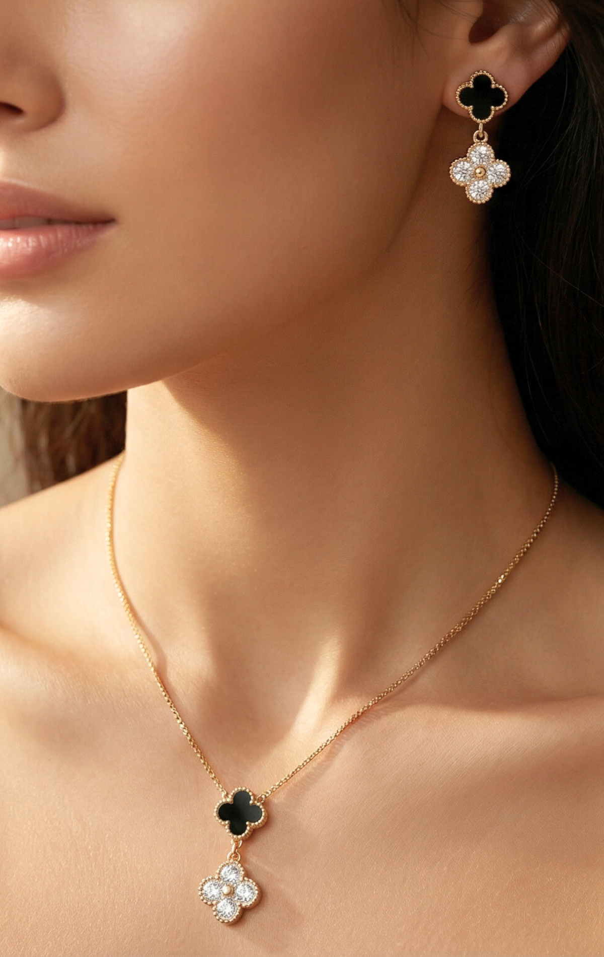 The earrings pair a chic black clover with a delicate crystal drop, creating a look that is both classic and modern. The matching necklace completes the set with the same iconic motifs, offering a coordinated elegance perfect for both everyday wear and special occasions.